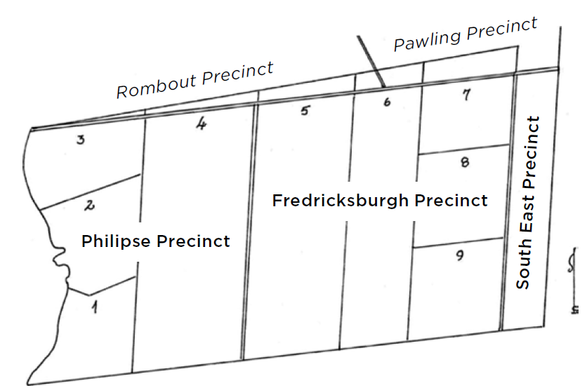 In April 1772 due to significant population growth, the South Precinct was split into three precincts: Philipse along the Hudson River encompassing lots 1–4, Fredricksburgh for the interior lots 5–9, and South East for The Oblong lands.9