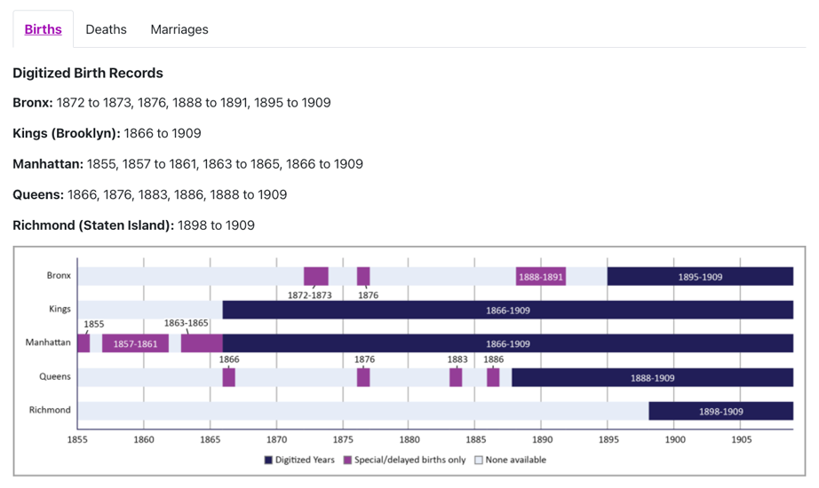 The New York City Municipal Archives has been working to digitize the millions of birth, marriage, and death records it holds since 2013. With the project now 70% complete, 9,318,625 digitized records from the late 1800s to the early 1900s are now available online as of March 2022.
