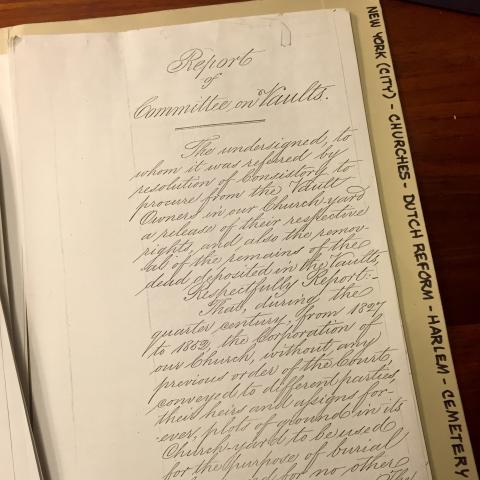Prompted by New York City's northward growth, the Consistory of the Dutch Reformed Church of Harlem purchased a plot in Woodlawn Cemetery in 1869. The remains interred in its old cemetery in First Avenue between 124th and 125th Streets, and also those in the churchyard on Third Avenue and 121st Street, were removed to the plot in Woodlawn; the transfer was completed in 1875. A manuscript file containing documentation relevant to this process has been digitized and made available in our digital elibrary.