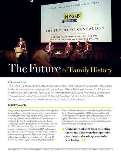 So much has changed in the world since we first planned the Spring 2020 issue of the New York Researcher. Adjustments to the NYG&B’s activities, including In-person programming, a free webinar series, and finding ways to continue serving our community through technology, have been at the forefront of our operations. We appreciate and respect those on the frontline of the COVID-19 outbreak. The impact of the pandemic touches everyone—and will continue to do so for the near future.