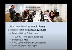 The CJH’s catalog provides information on individuals, places, and institutions. Mr. Arden will show how to best utilize the catalog to reveal new information and relevant leads for your research.