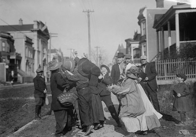 On Thanksgiving Day, children all over the city would don costumes of all sorts - masks and hats were worn, and many put on old baggy clothes from their parents or even the clothing of their opposite-gendered sibling.