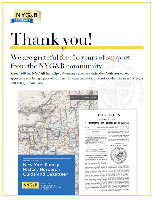 On a final note, thank you for your support of the NYG&B and our mission. The work we do not only helps others discover new ancestors, it builds a strong foundation for future genealogists. Your membership and support enables us to ensure the preservation of New York’s stories.