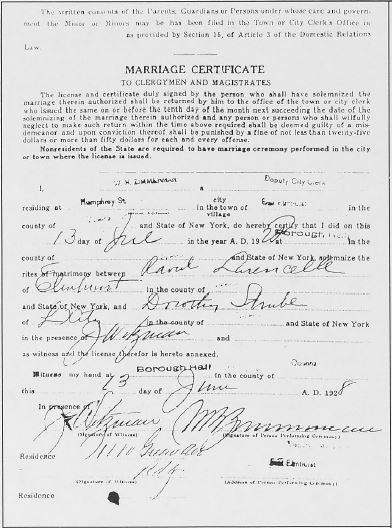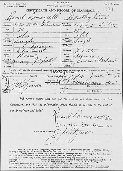 Searches of the groom's indexes revealed that a “Ravul” LAURENCELLE had married in Queens on 13 June 1928. I viewed the marriage certificate (see figure 2). The name of the groom on the top of the certificate, filled out by the deputy city clerk who had performed the ceremony, was indeed Ravul, but the groom's signature was clearly “Raoul.” His bride: Dorothy STRUBE. In this case the certificate contained their birthplaces: Elmhurst for the groom, L.I. City for the bride. His parents: Raoul LAURENCELLE and Mary ZAPALL or—the handwriting was unclear—was it ZAFALL? Oh dear. ZAPALL/ZAFALL was not ZUFALL, the name my client had. Which name was correct? Time to find a marriage license.