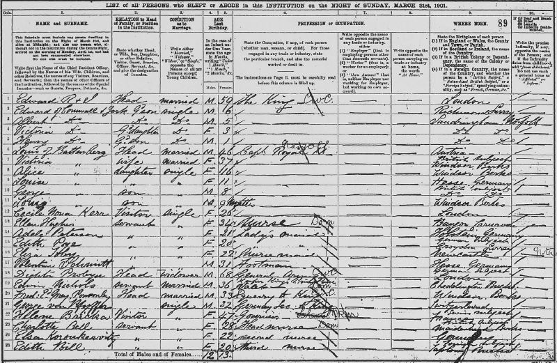 This 1901 Census record for Windsor Castle was found by using the “Institution Search” feature. Listed are King Edward (Edward R&I [King and Emperor] –occupation “The King”), several of his grandchildren and other family members, as well as visitors and servants. Curiously, Queen Alexandra is not listed as present in the household at the time the count was taken.