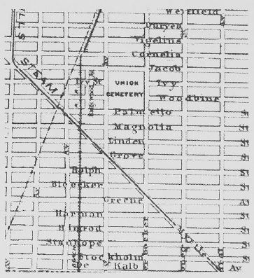 The new Union Cemetery (U.C.) (1851-94), which was about 10 acres in size, was in Brooklyn, near the Queens County border. There were about 30,000 interments prior to sale of the land and removal of remains to Cedar Grove Cemetery (C.G.) in Flushing, Queens, at the end of 1897.