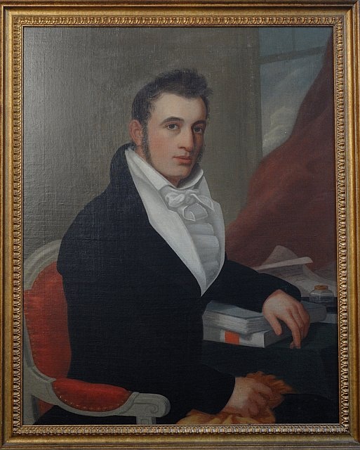 "man with long sideburns, wearing dark coat and white ruffled shirt seated in red upholstered French armchair – left arm leaning against books on table with papers and inkwell –greenish-brown background with window and red drapery at right – c. 1840. Value vague as artist unknown as yet.”