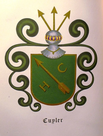 Cuyler is Dutch for archer or bowman, making these canting or punning arms, which contain a visual reference in the arms to the surname of the bearer. And, while there is a crest, there is no torse.