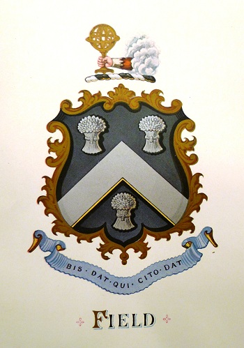 John Field was an early English astronomer, which explains the crest. He was known as the Proto-Copernicum for introducing the controversial theories of Nicholas Copernicus to England. There are several Field families listed with the same arms, including one “of Horton, Shipley and Ardsley, Co. York, and Bayside and Flushing, New York; confirmed to John Field, of East Ardsley, 4 Sept. 1558.”