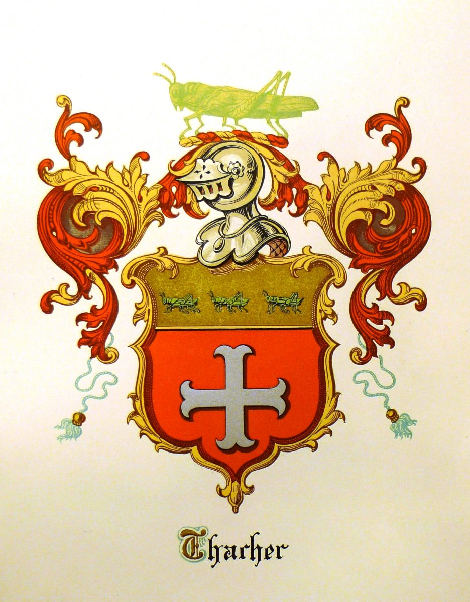The first item that will be noticed is that the crest in the art differs from Burke's. America Heraldica mentions both crests. Author John R. Totten, then Record editor, notes that some English families also used three birds volant Azure in the chief. The arms in the art were used in a seal impressed in wax on a letter dated 16 August 1676 from Rev. Thomas Thacher, pastor of the Old South Church, Boston, to his son in London. The American Thachers descend from Rev. Peter Thacher of Queen Canal, Co. Somerset. His widow's will includes a seal with these arms which includes the grasshopper crest.
