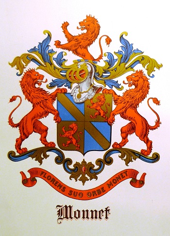He was a Huguenot who had fled at the Revocation of the Edict of Nantes. He emigrated in 1707. Orra Monnet was an officer or member of many ancestral societies. This is a striking depicting of arms containing bold, red lions. The supporters are well drawn but appear a bit too big for the shield.