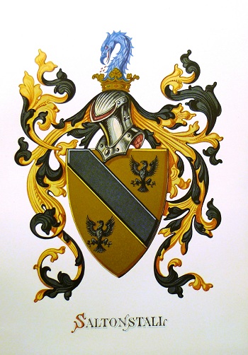 John Reynolds Totten submitted a pedigree which identified the earliest known ancestor as Gilbert Saltenstall (16th century), father of Richard Saltonstall, Lord Mayor of London, and of Samuel Saltonstall whose son Sir Richard came to the New World in 1630 as part of the Massachusetts Bay Company. Sir Richard returned to England, but his son, the Hon. Richard Saltonstall, returned with family. Hon. Richard's son, Gurdon (1666-1734) became Governor or Connecticut in 1708 and held the position until his death. Other Saltonstalls had major roles in colonial history. Sir Samuel Saltonstall, another son of the Lord Mayor, was with the Virginia Company and named by Captain Smith as executor to his will. Overall, this is a very fine rendering of arms, but the splayed eagles on the shield are too small due to space constraints that could have been corrected by having a thinner bend. Notice the choice of the helm and compare it to the shape of the pelican’s head in the crest; the similarity of shape of the two makes a visually pleasing combination.