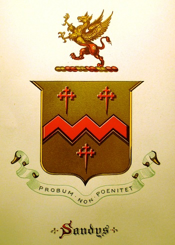 These arms appear with a family pedigree of James Thomas Sands. He reports the earliest American ancestor was George Sandys, a great grandson of Robert Sandys, of Rattenby.