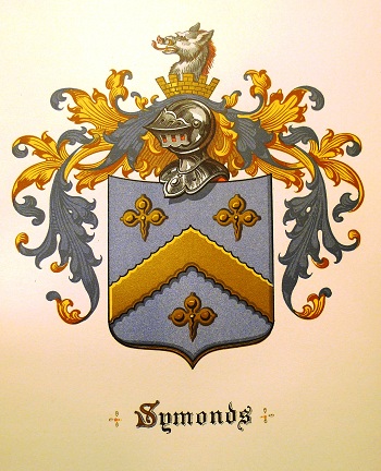 Woodin, Mary Louise. "Symonds Registration of Pedigree.” The NYG&B Record, Vol. XLII, No. 1 (April, 1912): 96-97, arms printed in No.3 (July 1912): after 288.