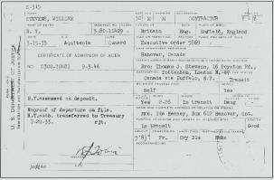 The A-File solved all of that, with a complete description of each arrival and why he had traveled. A total of five arrivals were found. The last three arrivals are the key to the whole file, as they occurred after 1 July 1924 when immigration was limited by quotas and immigrants were required to establish permanent legal residence. William Stevens had entered the U.S. prior to 1924, but he did not know the law and so when re-entering the country he tried to get around paying a head tax by claiming to be in transit to Canada instead of admitting to being a permanent U.S. resident. Most of his A-File of 77 pages consists of documents generated between 1946 and 1949 in his attempt to establish that he was a legal permanent resident of the U.S. If he had simply answered a few questions correctly upon each arrival, none of this would have been necessary.